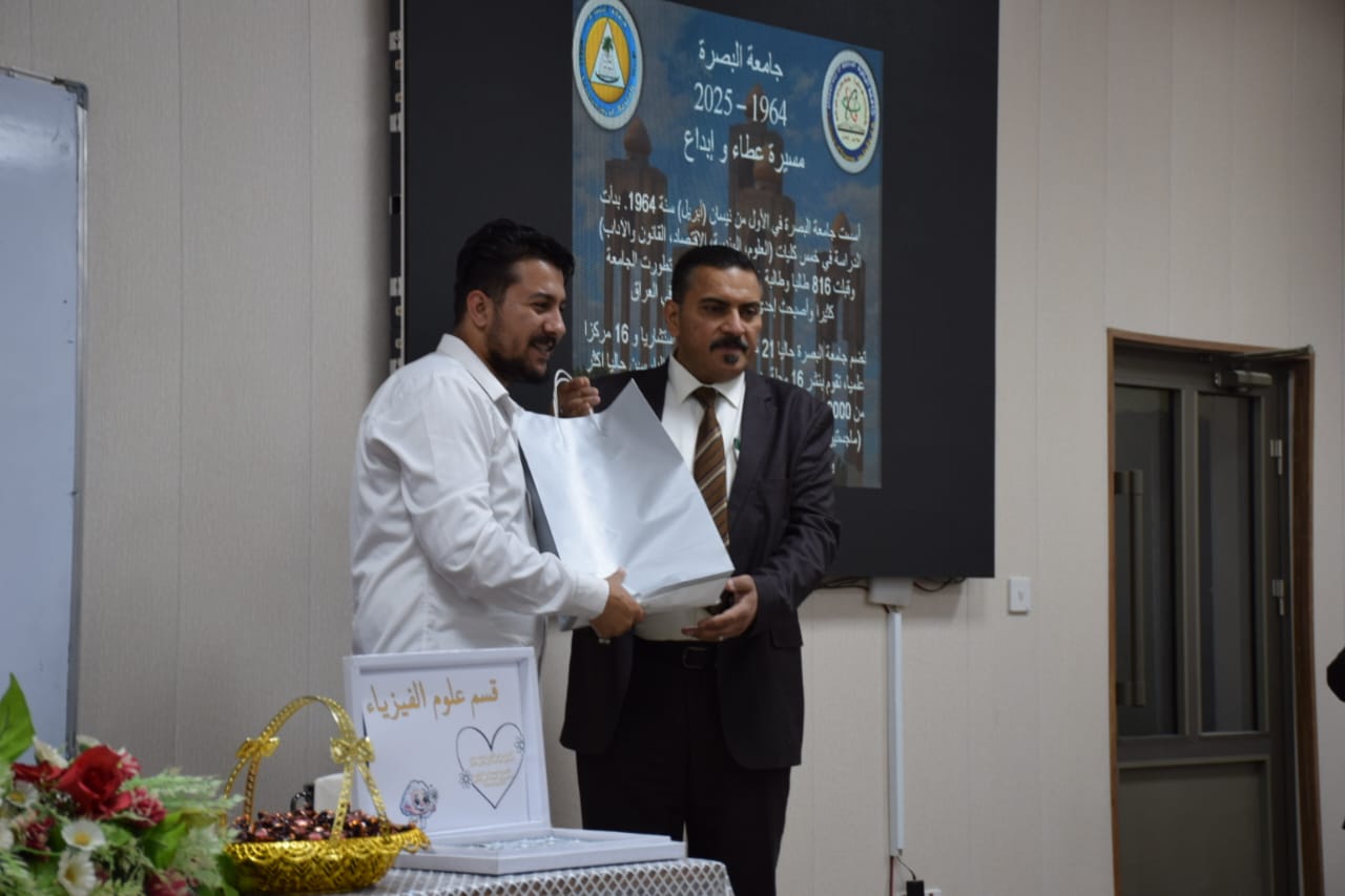 Under the patronage of the President of the University of Basra, Professor Dr. Muhannad Jawad Al-Asadi, and the supervision of the Dean of the College of Science, Professor Dr. Ali Abdul Imam Al-Riyahi, and in coordination with the Head of the Physics Department, Professor Dr. Wael Abdul Latif Kadimi, and as part of the Physics Department's activities on the occasion of University Day, a special celebration was held this morning, Sunday, April 20, 2025, at the College of Science. The event included honoring the top students of the previous academic year and the top students of the three levels of the current academic year, in recognition of their excellence and outstanding academic efforts. This initiative witnessed great interaction from the students, amid an atmosphere of pride and motivation to continue academic excellence.