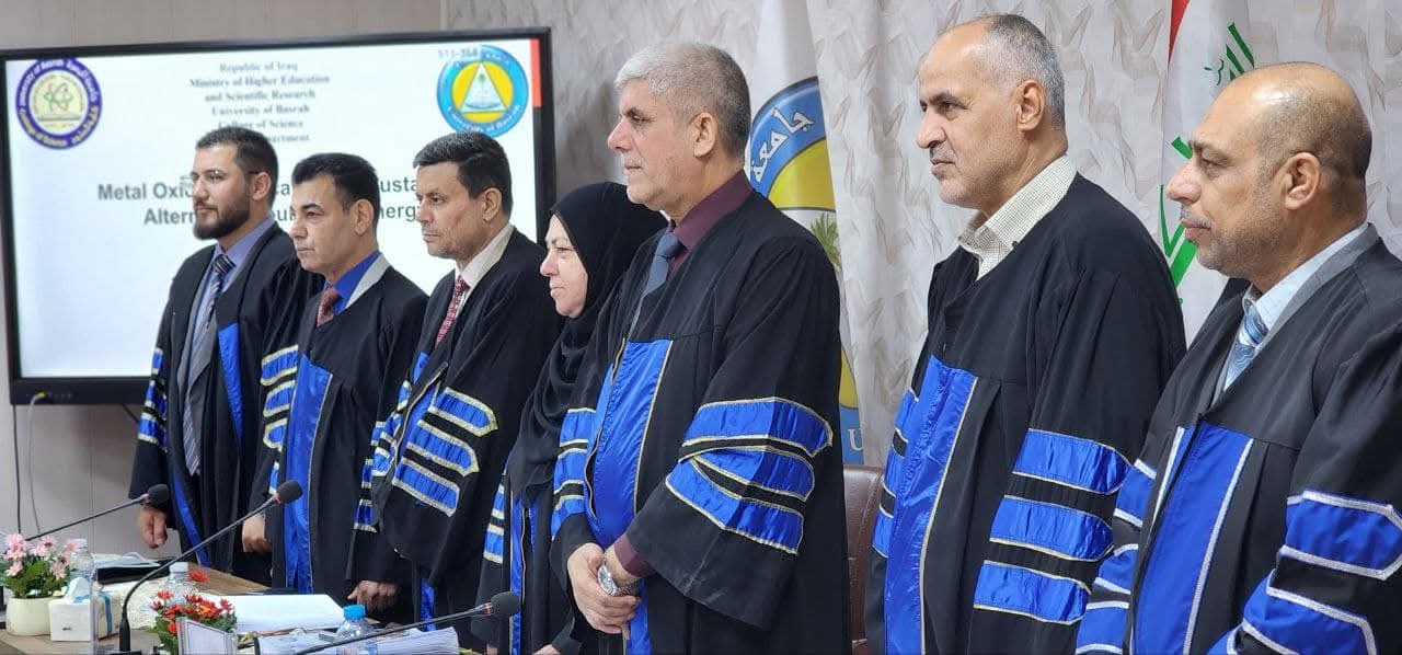 The Physics Department at the College of Science at the University of Basrah discussed the doctoral thesis of researcher Sattar Hussein Abdul Hassan Al-Awadi, entitled "Photocatalysis of Metal Oxides: Alternative Sources for Sustainable Energy." The thesis included the preparation and characterization of four metal oxide nanocomposites using experimental and theoretical techniques. The study aimed to evaluate their effectiveness in photocatalysis and the treatment of organic pollutants. The thesis concluded that the compounds CuAl₂O₄, V₂O₅, Fe2O3, and MgSnO2 showed the highest degradation efficiency of 85% in 120 minutes, supported by theoretical results with an agreement of 82%, confirming their feasibility in sustainable energy applications.