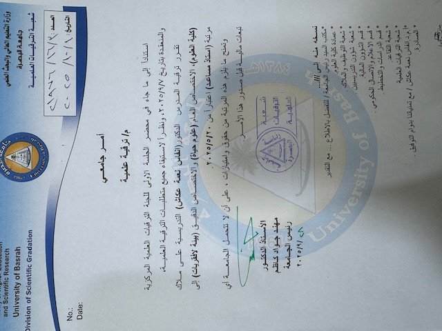Dr. Anfas Nima Akash, from the Department of Ecology at the College of Science at the University of Basra, has been promoted to the rank of assistant professor, in accordance with the instructions of the Central Promotions Committee at the University of Basra.