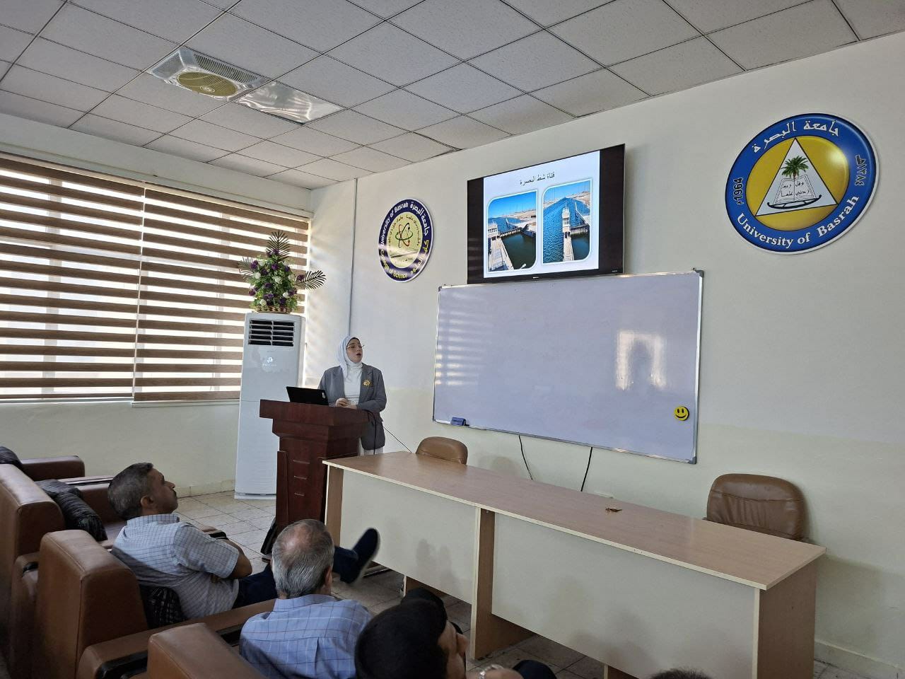 The seminar, presented by master's student Zahraa Jassim Muhammad, aimed to identify the importance of the Shatt al-Basra Canal and the impact of pollution on its environment and water quality.