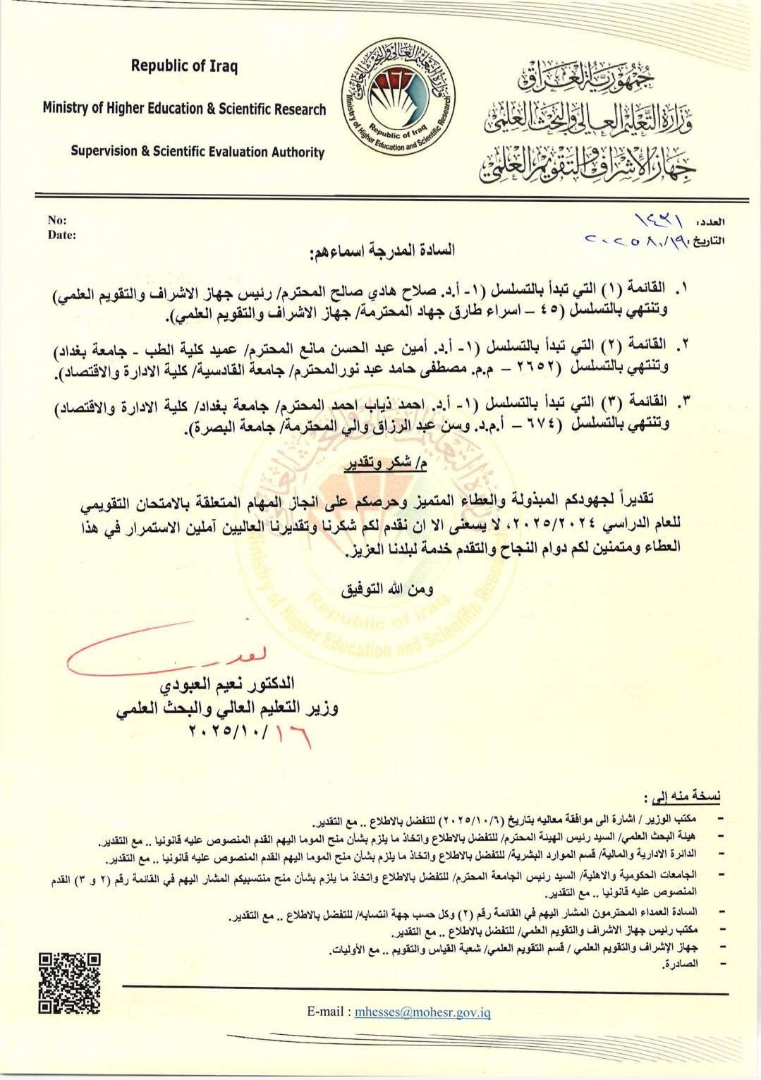 The Ministry of Higher Education and Scientific Research/ Scientific Supervision and Evaluation Authority sent a letter of gratitude and appreciation to Dr. Adel Ali Abdul Hassan al-freiji, associate dean of the Faculty of Science for Scientific Affairs and graduate studies at the University of Basra, for his efforts, exceptional contributions, and eagerness to finish the calendar exam-related tasks for the 2024–2025 academic year.