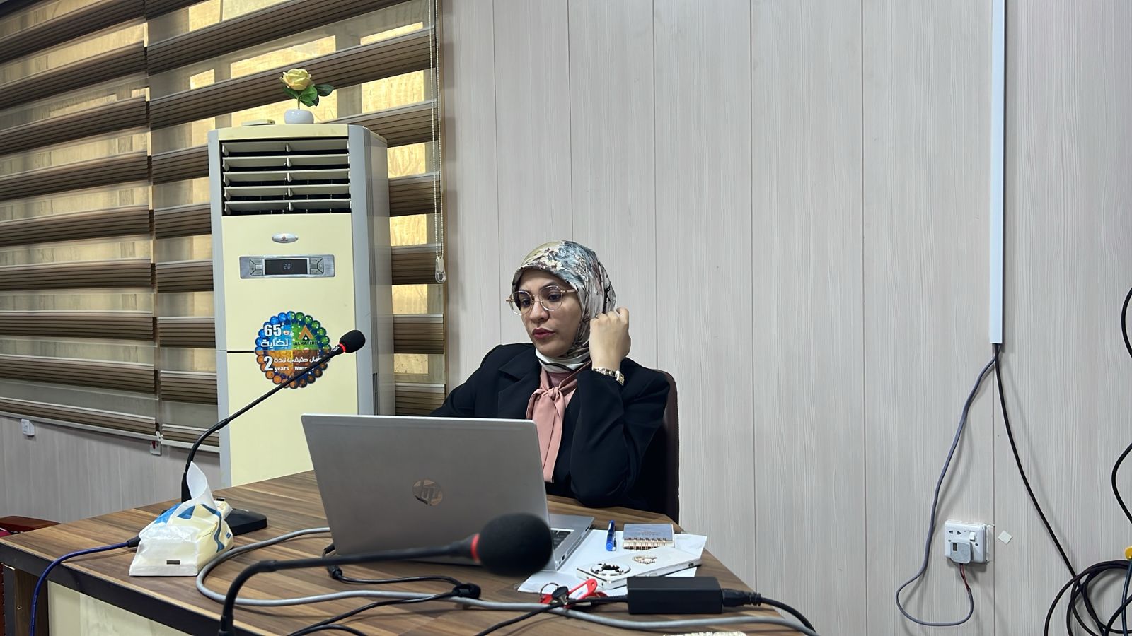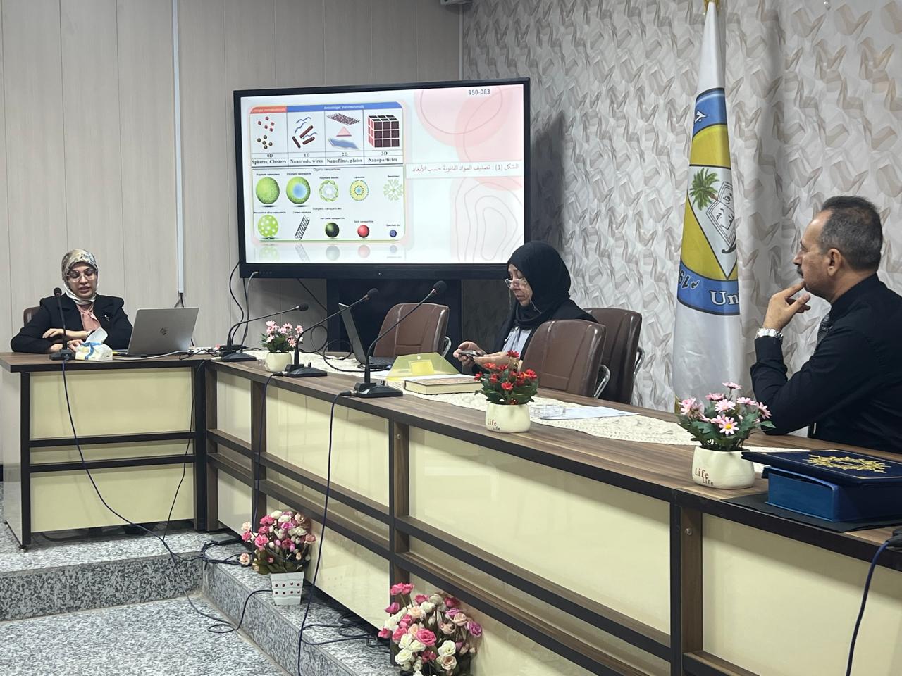 The Physics Department of the College of Science at the University of Basrah organized a seminar entitled Photoelectrochemical Activity of Surface-Modified SnO₂ Nanoscale Thin Films, presented by graduate student Sahar Khudair Tawfiq from the Physics Department.