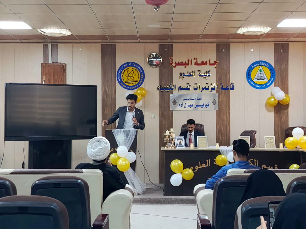 Under the auspices of the dean of the Faculty of Science, Prof. Dr. Ali Abdul Imam Riahi, and under the supervision of the head of the chemistry department, Prof. Dr. Abbas Fadel Abbas, the chemistry department, in cooperation with the Student Activities Division, held a joyful forum on the occasion of the birth of Mrs. Zainab (peace be upon her) on Wednesday morning, 10/29, in the chemistry department. The forum was attended by Sheikh Mohammed Al-Rikabi, poet Hadi Mohammed, and poet Sajjad Al-Halfi, who added a distinctive spiritual atmosphere to the event. The ceremony concluded with the affirmation of the attendees to be inspired by the noble values of the biography of Mrs. Zainab (p) in patience, fortitude, and knowledge.