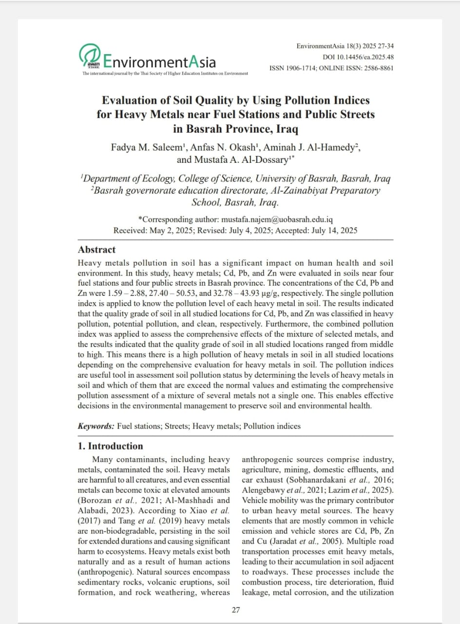 A scientific study conducted at the University of Basra by faculty members Dr. Fadia Mushtaq Salim, Dr. Anfas Ni'ma Akkas, and Dr. Mustafa Abdul Wahab Najm in the Department of Ecology at the College of Science investigated soil quality near public roads and gas stations in Basra Governorate based on heavy metal pollution using various pollution indicators.