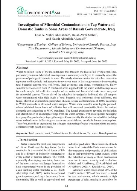 A scientific study conducted at the University of Basra by faculty members Inas Awni Mahdi and Dr. Nasser Abdullah Helou from the Department of Ecology at the College of Science investigated microbial contamination in tap water and household water tanks in various areas of Basra Governorate.