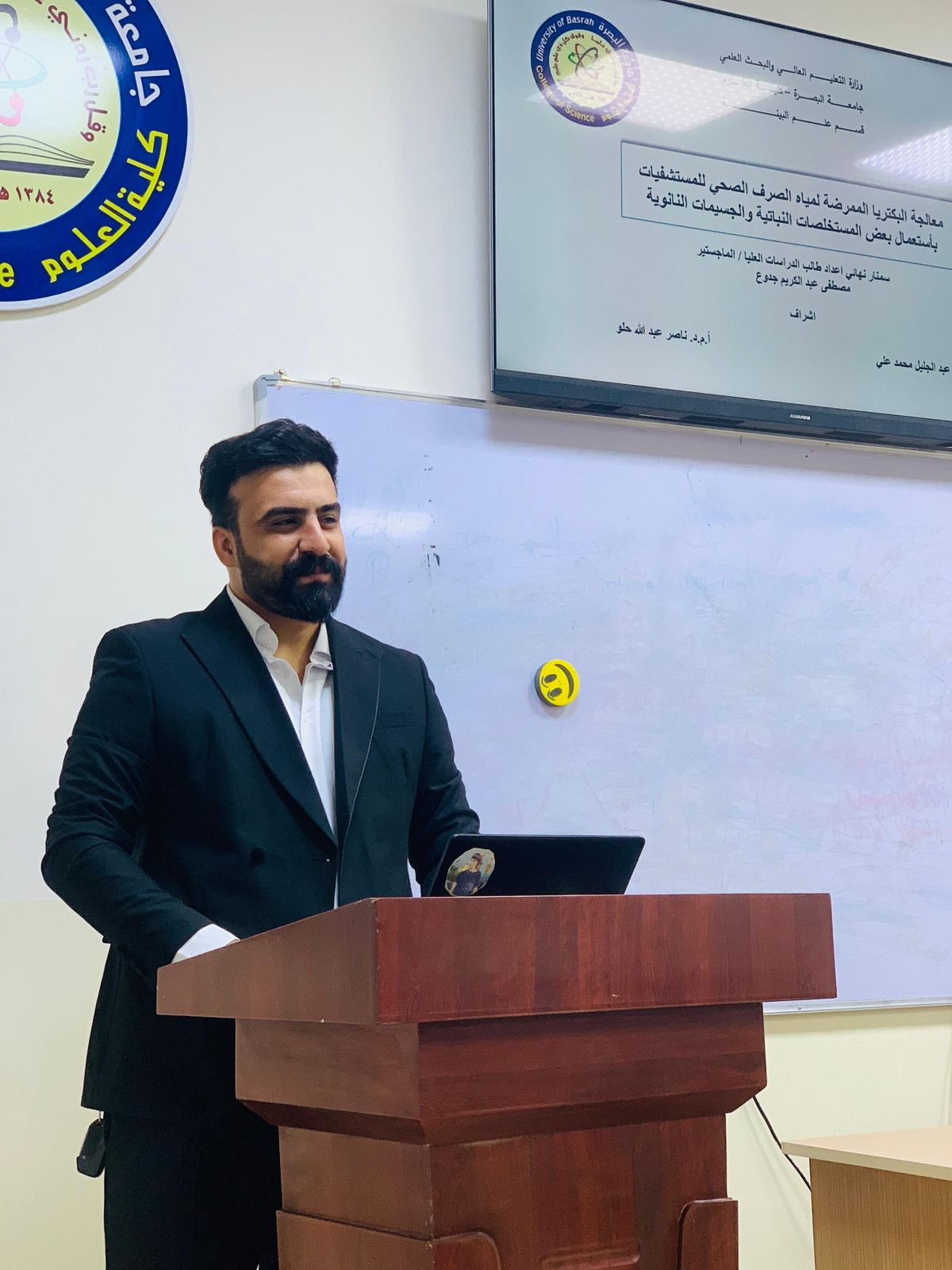 The seminar, presented by Master's student Mustafa Abdul Karim Jadou, aimed to promote the biological treatment of bacterial-contaminated water using plants. This method is considered safe, environmentally friendly, and effective in eliminating pathogenic bacteria.