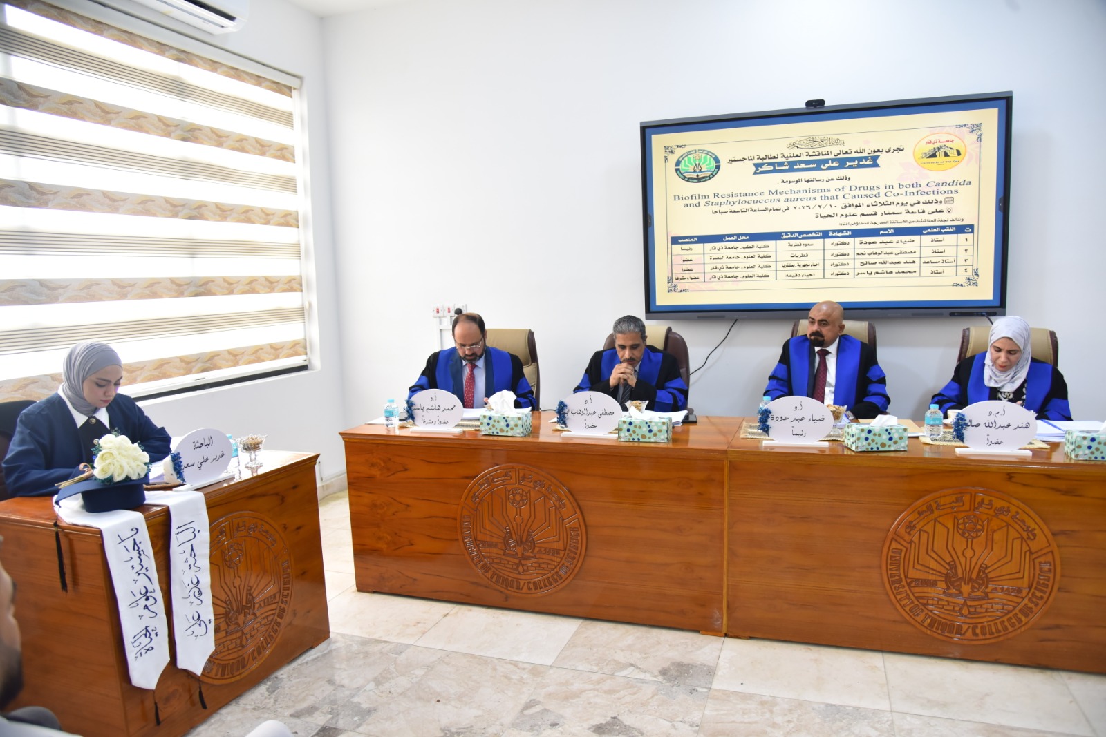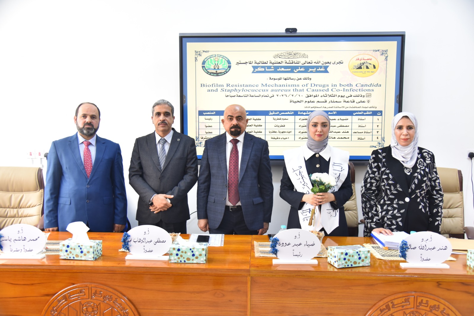 Dr. Mustafa Abdul Wahab Najm, a faculty member in the Department of Ecology at the College of Science, participated in the discussion of the master's thesis of student Ghadeer Ali Saad Shaker, entitled (Biofilm resistance mechanisms of drugs in both Candida and Staphylococcus aureus that caused co-infections), which was organized by the College of Science, Department of Biology, Thi Qar University.
