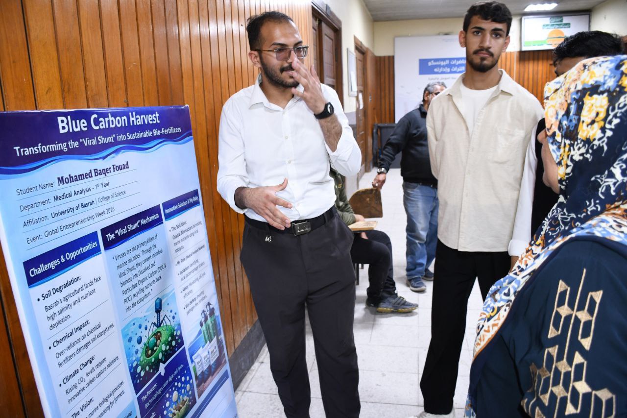 The project aimed to exploit the phenomenon of the "viral pump" in the marine environment to convert organic carbon and algae into high-efficiency organic fertilizers. The project is aimed at isolating and diagnosing specialized viral strains and employing them in "bioreactors" to produce environmentally friendly agricultural nutrients, which contributes to reducing carbon emissions and solving soil salinity problems in Basra governorate.