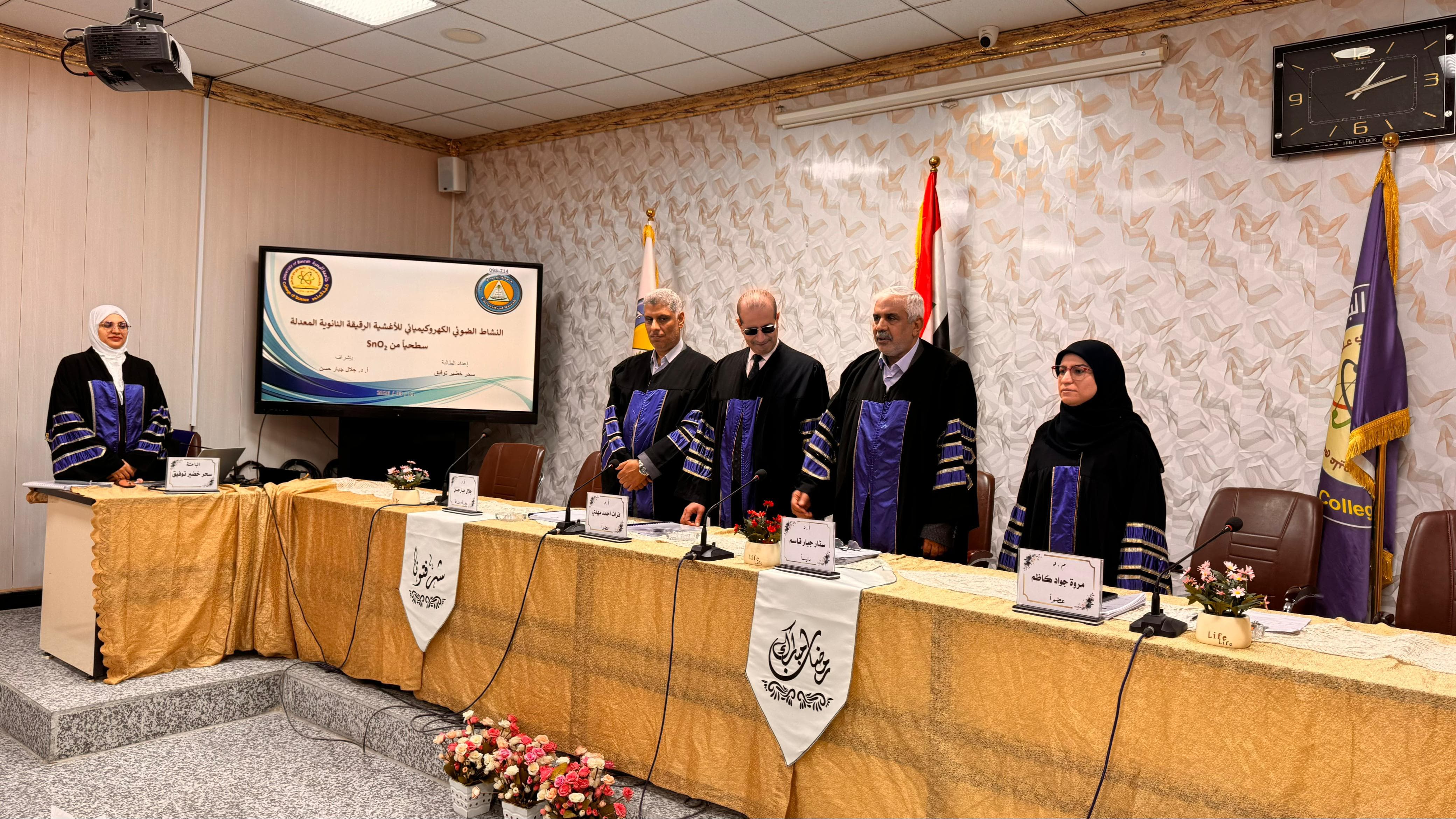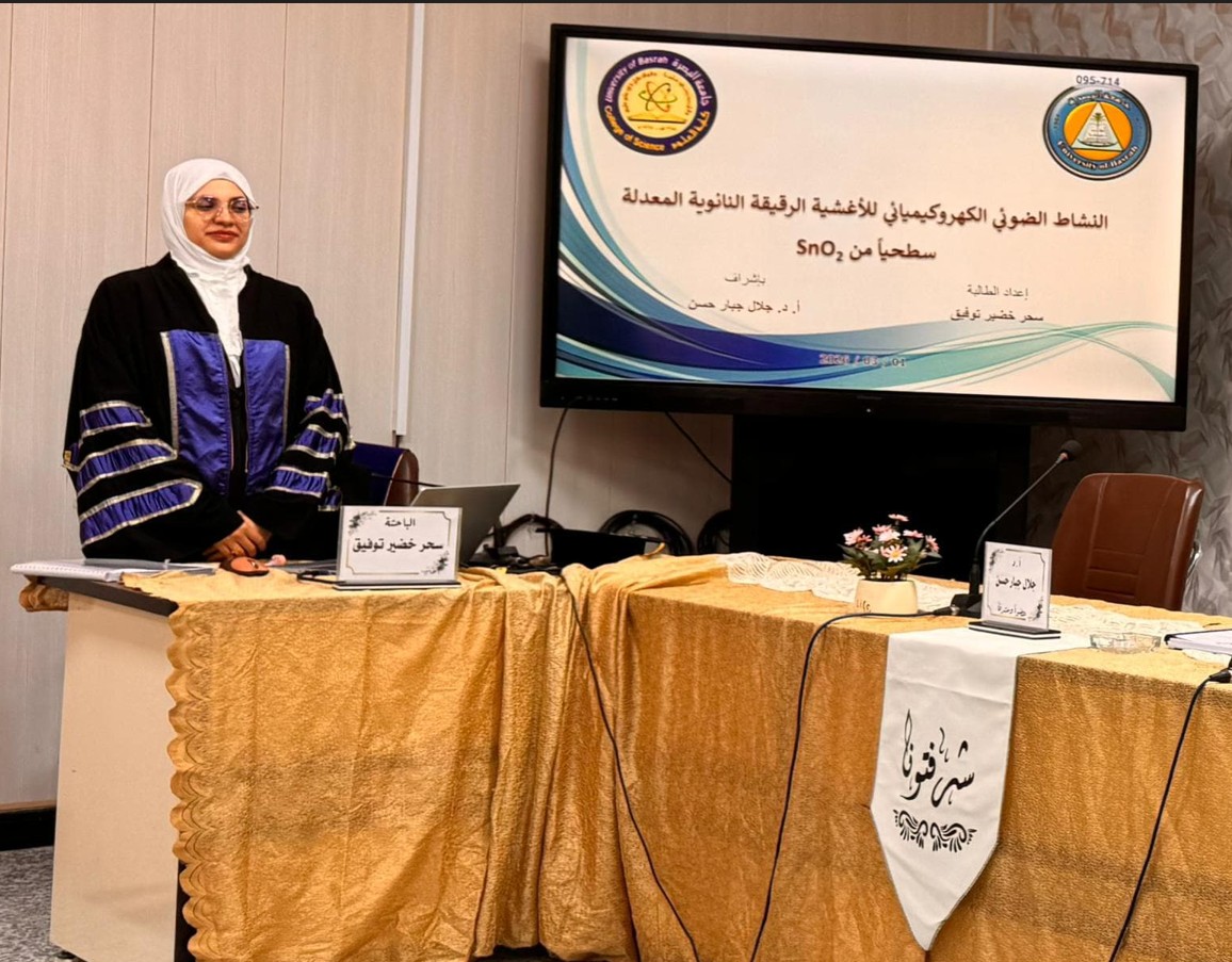 A master's thesis entitled The Photoelectrochemical Activity of Surface-Modified SnO₂ Nanoscale Thin Films was discussed in the Physics Department of the Faculty of Science at the University of Basra by graduate student Sahar Khudair Tawfiq.